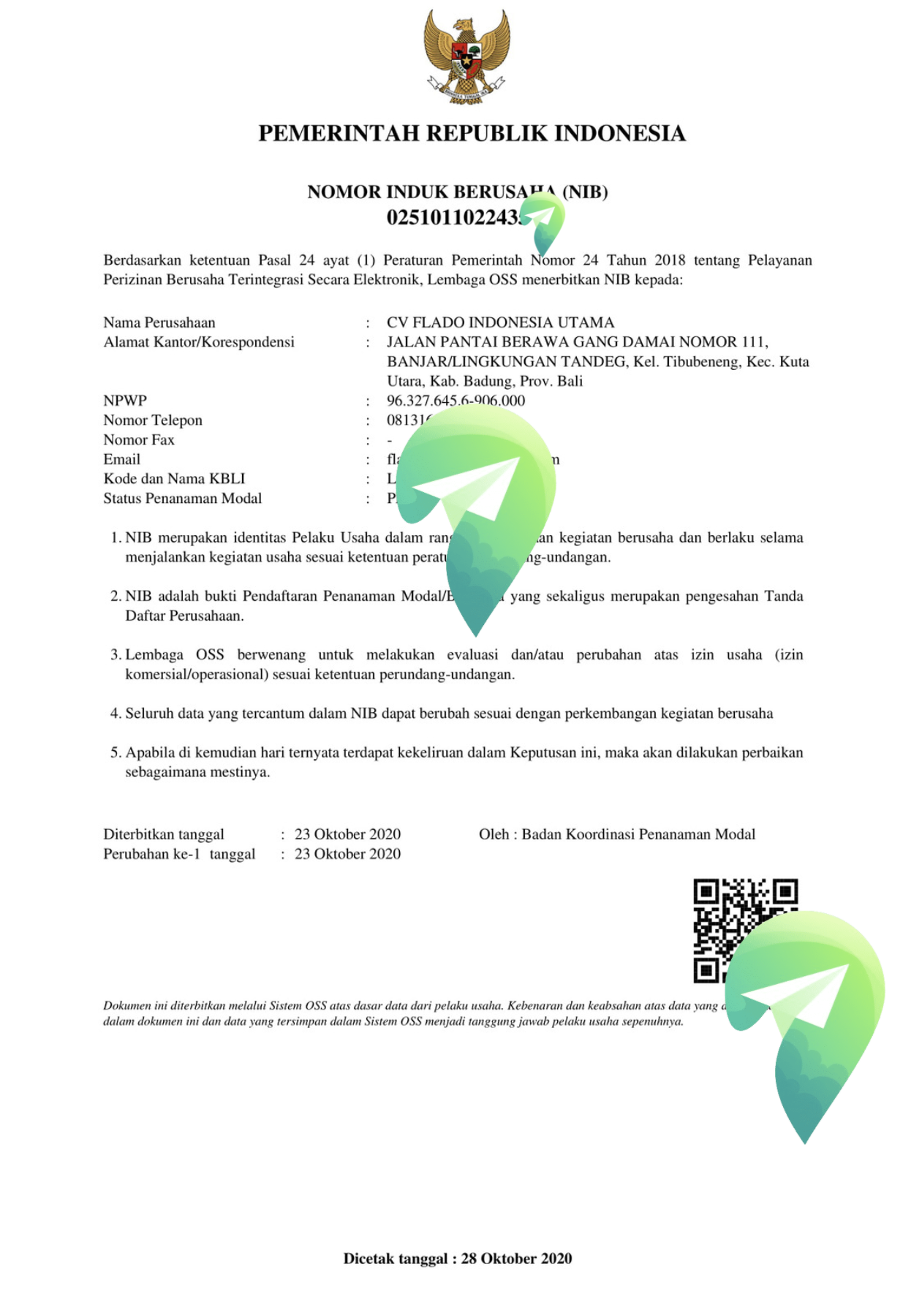 • NIB (Nomor Induk Berusaha): 0251011022435